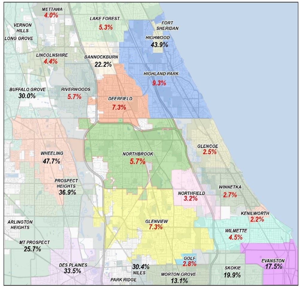 The latest estimates by the State of Illinois (2018) found that 5.70% of the housing units in Northbrook are affordable. Despite having adopted the 2005 Affordable Housing Plan, the Village had only moderate success implementing the original plan. The map below illustrates the percentage of housing units that were “affordable” in 2018 for Northbrook and nearby municipalities based on the State of Illinois definition.